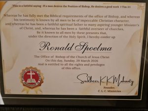 Bishop dr. Rev. Ronald Spoelma Arth Bishop Ochei Ochei Innocent Bishop Ochei Innocent is a full time bible teacher in Theology & Church management. President, New Day College of Bishops and Apostles aka New Day Ministerial Association Inc